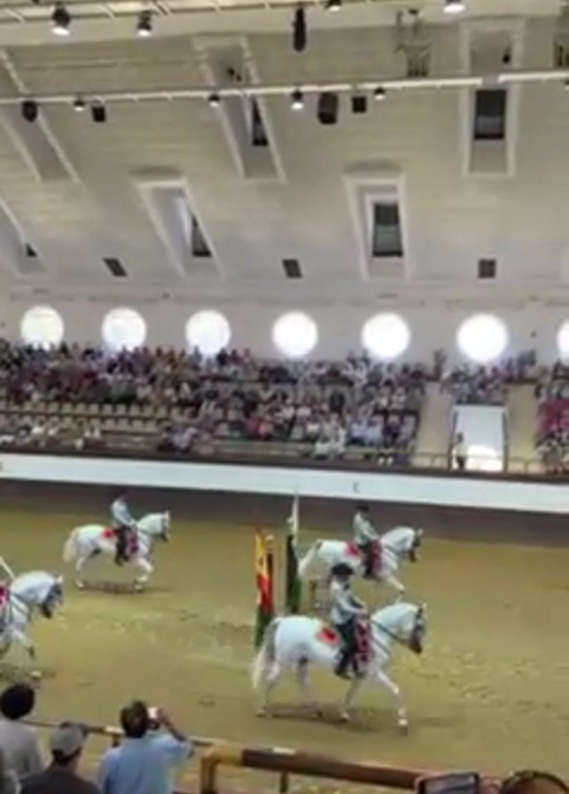 horse show taking place in a large indoor arena. There is a crowd of spectators in the stands, observing a performance with several white horses being ridden around the arena. The riders are wearing hats and jackets, and they are each carrying a flag, including a Spanish flag and an Andalusian flag. The arena is covered in sand, and the overhead lighting is bright. The building’s ceiling has a pattern of triangles and circles. The audience is filming the event with their cell phones.