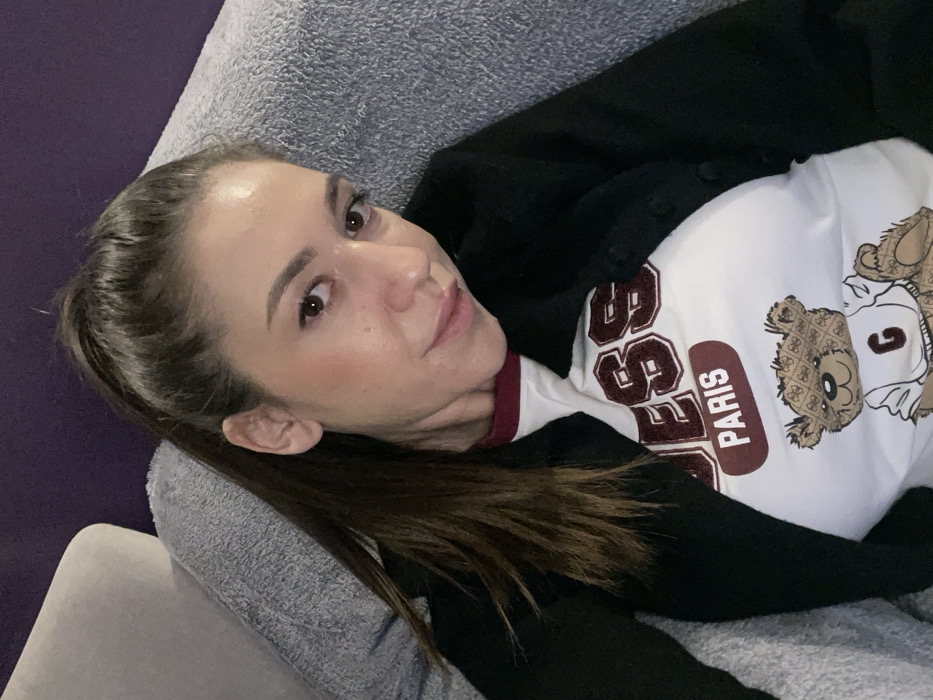 A female is positioned indoors, reclining on a light grey, textured fabric sofa. She has dark brown hair pulled into a high ponytail. Her face, with a fair to medium complexion, exhibits natural skin texture. She is looking directly at the camera. She wears a white t-shirt with a maroon collar, featuring the maroon text 'GUESS PARIS' above a graphic of a brown teddy bear wearing a white shirt with a red 'G'. Over the t-shirt, she wears a dark-colored, buttoned cardigan. The background consists of a solid dark purple wall. The location is Sofia, Bulgaria.