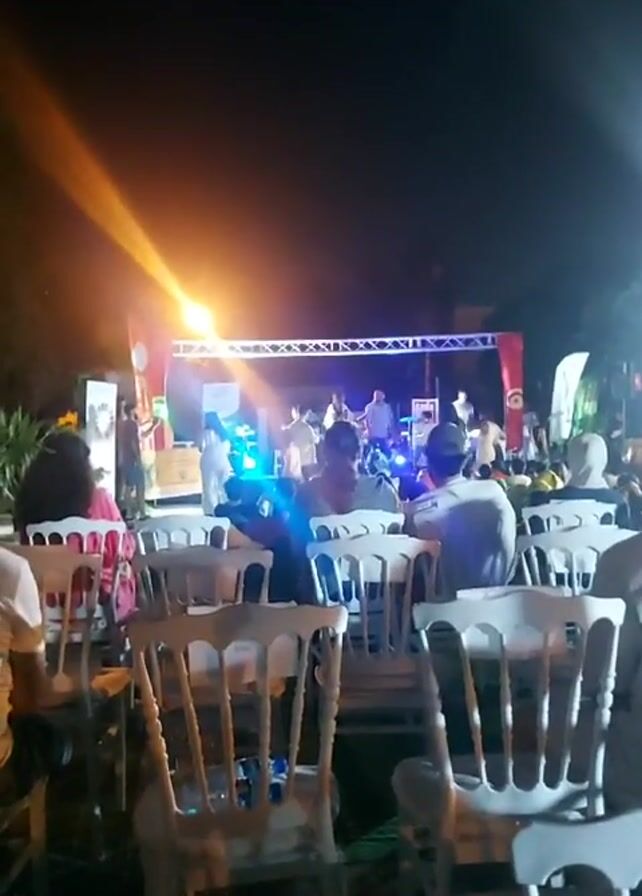 Here is a forensic description of the video: The video captures an outdoor event at night, featuring a stage illuminated by bright lights. Several people are visible on and around the stage, but their specific actions are difficult to discern due to the distance and lighting conditions. In the foreground, numerous white chairs are arranged facing the stage, suggesting an audience seating arrangement. The chairs appear to be occupied, as people are seated in them, their backs towards the camera. The background is dark, indicating the event is taking place after sunset, with the stage lights providing the primary source of illumination. Flags and banners are placed behind the stage. The overall impression is of an organized outdoor gathering, likely a performance or presentation of some kind.