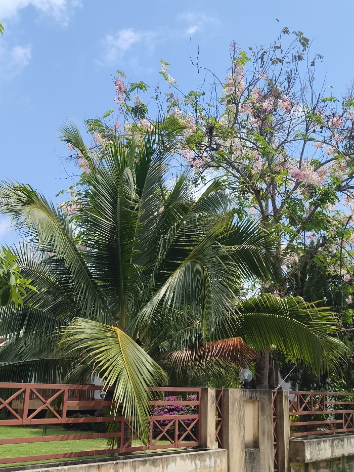 The image depicts a tropical outdoor scene in Baan Hua Thanon, Thailand, under a clear blue sky with minimal white clouds. A large coconut palm tree, characterized by its numerous long, green fronds, occupies the center-left and mid-ground. Behind and to the right of the palm, a deciduous tree with light pink and white blossoms is prominent, with some bare branches visible. Below the trees, a reddish-brown railing featuring distinct 'X' patterns extends horizontally across the frame. Behind this railing, a patch of small purple flowering plants is visible, along with a section of green grass. In the lower foreground, a light grey concrete structure, possibly a wall or the base of a fence, with a visible rectangular pillar on the right, runs horizontally. A small, circular, white light fixture is positioned on a pole or wall behind the brown railing on the right side. No people or animals are present.