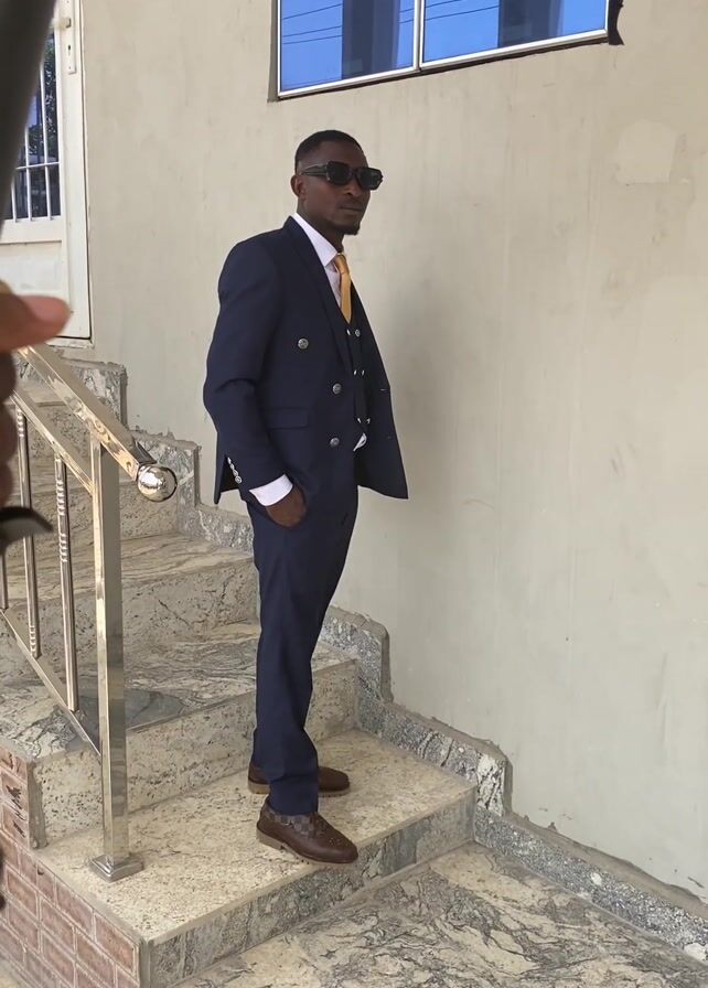 A man wearing a dark blue suit, white shirt, yellow tie, brown shoes, and dark sunglasses poses on a staircase with a marble-like pattern. He has one hand in his pocket. The staircase has a silver metal railing. The background includes a light beige wall, a window with blue panes, and a partial view of a white door. The lighting is bright and appears to be outdoors. An obscured hand is visible in the bottom left corner, holding a reflective object. There is indistinct talking in the background.