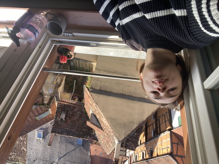 A young female, wearing a black and white striped knitted sweater, takes a selfie from a low angle, her head slightly tilted, looking directly at the camera with her tongue extended. She is positioned within an open dormer window with light-colored wooden frames. On the interior windowsill to her right are a potted cactus with a vibrant red top, a grey ribbed ceramic mug, a clear plastic water bottle, and a purple plastic spray bottle. The window overlooks a dense cluster of historic buildings in Bouxwiller, France. Numerous reddish-brown tiled roofs are visible, varying in pitch and age, some featuring small dormer windows. A prominent half-timbered building with orange-brown timber frames on a lighter facade is visible across from the window. The scene is illuminated by strong sunlight, casting distinct shadows across the rooftops and facades of the old European architecture below.