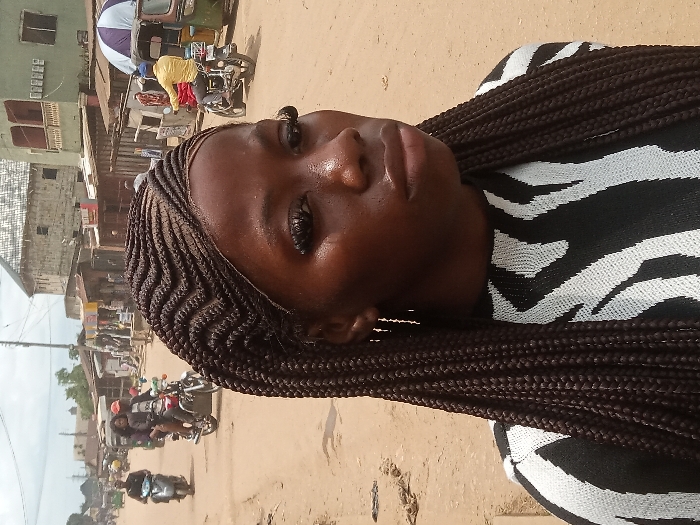 A young woman with dark complexion and long, dark brown box braids styled with zigzag cornrows on her scalp occupies the foreground, facing slightly right with her gaze directed off-camera