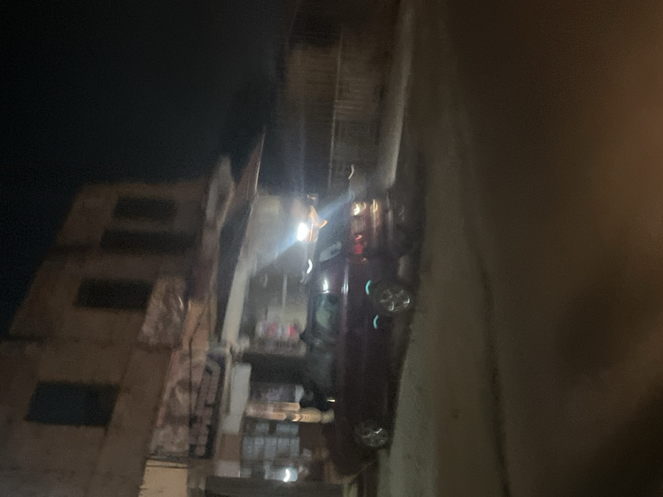 A blurry, angled night shot depicts a maroon car parked on the side of a dimly lit street. A multi-story building stands adjacent to the car, its windows appearing dark. The lighting is poor, and the image has significant motion blur. The background is a dark, murky sky. A street runs alongside the building and the car. The overall impression is one of a poorly lit urban scene.
