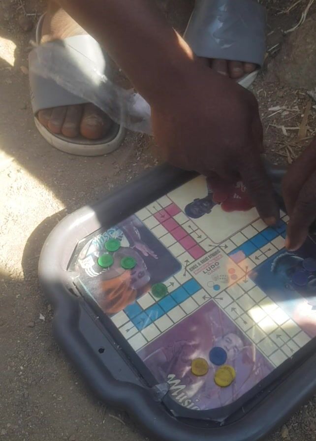 two people playing a game of Ludo outdoors