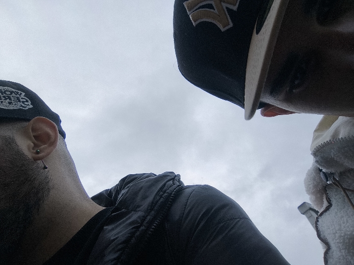 The scene depicts two individuals captured from a low-angle perspective against an overcast, cloudy sky in Dresden, Germany. On the left, a male subject is partially visible, from the upper chest to the top of the head. He has a dark beard and wears a black beanie with a white, inverted text logo that appears to read "WORLD SERIES" in part. His left ear is visible, featuring a small black stud piercing in the lobe and a black barbell piercing that extends downwards. He is wearing a dark, possibly black, quilted or puffy jacket. On the right, a second subject is partially visible, from the upper chest to the top of the head. This individual wears a black baseball cap with a light brown/tan brim and a prominent gold/tan stylized logo on the front, resembling block letters like "NY" or similar. The subject's right eye and a portion of the face are discernible, looking downwards. They wear a light-colored, possibly off-white or cream, sherpa or fleece-lined jacket with a visible zipper. The environment consists solely of a uniformly gray, cloudy sky, offering no discernible landmarks or other contextual features. No direct interaction between the two subjects is apparent. Both individuals appear to be looking generally downwards, towards the camera's position.
