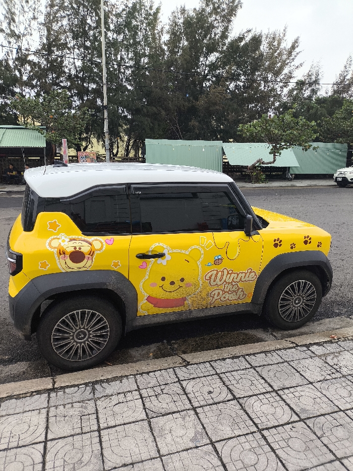 - "A yellow and white compact vehicle, adorned with "Winnie the Pooh" themed graphics including images of Winnie the Pooh and Tigger, honey drips, and paw prints, is parked curb-side on a street in Thành phố Tuy Hòa, Vietnam" by FM-ETbE83, licensed under CC BY 4.0