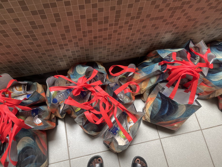 The image displays an indoor setting featuring a light-colored tiled floor and a brown wall covered in small, diagonally arranged square tiles. Lined up along the wall are approximately twelve to fifteen reusable shopping bags. These bags exhibit a multi-colored abstract pattern, predominantly in shades of blue, orange, and brown, and are equipped with prominent red fabric handles. Many of the bags are open, revealing contents that include clear plastic water bottles, various canned beverages (one labeled "MAR...U", another a silver can with an orange logo), and packaged items such as a white opaque bag and a green package. Several red bag handles are tied into bows or loops. Two feet, wearing black slide sandals, are partially visible on the tiled floor in the lower-left quadrant. The specific location within Abuja, Nigeria, cannot be determined from the visual evidence provided. The arrangement suggests the bags are prepared for distribution or collection.