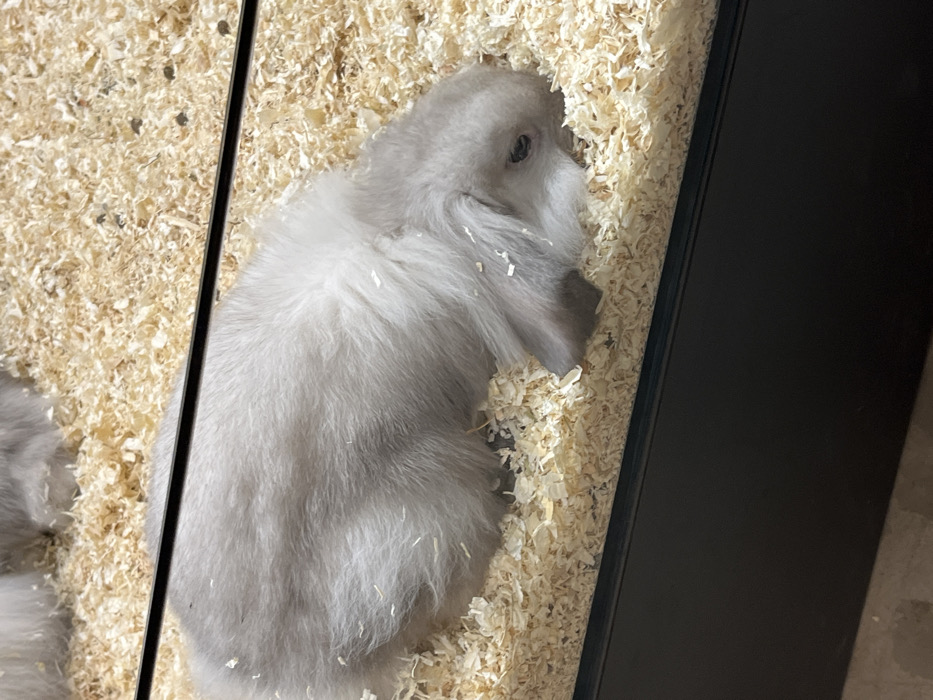 - "The image depicts an indoor scene in Veliko Tarnovo, Bulgaria, featuring a light grey rabbit within a glass enclosure filled with wood shavings" by FM-47eGY2, licensed under CC BY 4.0