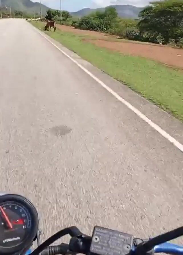 A first-person perspective video shot from a motorcycle traveling on an asphalt road. The road is bordered on the right by a grassy embankment and a field. A cow is grazing by the side of the road. Further back, there are trees, fields, and hills. Utility poles line the side of the road. The sky is blue with puffy white clouds. The dashboard of the motorcycle is visible in the foreground. The motorcycle speeds past the cow.