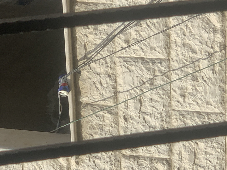 The image displays a section of a building in Ma'raba, Syria, under daytime lighting. A wall constructed of light-colored, textured, approximately rectangular stone blocks fills the majority of the frame. At the upper center, a dark window opening or recess is visible, below which a light-colored sill extends horizontally. Resting on this sill are two aluminum beverage cans. The foremost can is blue and white, identifiable as a Pepsi brand product, with its top opening clearly visible. Behind it, a second can, appearing red and white, is partially obscured. Multiple electrical wires are present. A single thin green wire runs diagonally from the lower left towards the upper middle of the wall. To the right, several thicker, dark-colored wires run from the upper right portion of the frame, across the sill near the cans, and descend towards the lower right. Another dark wire appears to run horizontally near the top of the sill. The foreground features dark, out-of-focus vertical elements on the left and right, suggesting the image was captured through a grate or similar obstruction. Strong shadows from these elements and the wires are cast upon the stone wall. No individuals or active subjects are present in the scene.