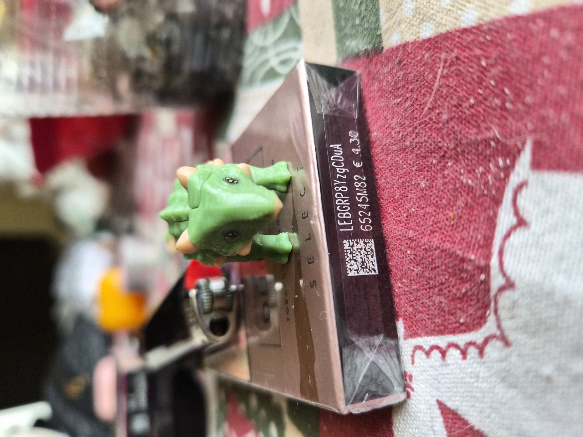 A close-up image shows a pack of tobacco resting on a red and white patterned surface. A green toy dinosaur with orange spikes is clipped onto the side of the pack. Adjacent to the pack is a metal lighter. The background is blurred, but suggests an interior setting with various objects. The label on the tobacco pack includes the text "LEBGRP8YzgCDuA 65245M82 € 4.30" and a QR code. The context suggests this might be indoors, but the location in Plovdiv, Bulgaria cannot be determined from this image alone.