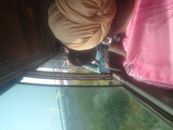 The image displays the interior of a passenger vehicle, likely a bus or commercial van, viewed from the perspective of a seated occupant looking towards the left side window. In the foreground, the back of a person's head and right shoulder are visible, the head covered with a light brown, turban-style headwrap. A silver earring or ornament is discernible on their right ear. A pink, textured fabric item, possibly a seat cover, occupies the lower right foreground. Behind the primary foreground figure, another passenger is partially visible, wearing a patterned blue and teal garment. The vehicle's interior features brown paneling on the walls and ceiling. Through the window, an outdoor environment is seen. Immediately adjacent to the vehicle, dense green vegetation, appearing as tall grass, is prominent. Beyond the grass, a wooden fence structure runs parallel to the vehicle's direction of travel. In the middle ground, a concrete bridge or overpass structure is visible under a light blue sky. The scene depicts travel through the city of Alaiyabiagba, Nigeria.