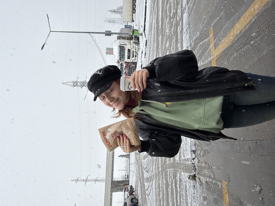 A female subject is depicted standing outdoors in Argveta, Georgia, during a snowfall. She is smiling with eyes partially closed, looking upwards and to her right. She wears a black cadet cap, a black bomber jacket over a light green hooded sweatshirt, and blue jeans. Her fingernails are painted pink. In her left hand, she holds a brown paper bag labeled "DUNKIN'" with a visible QR code. In her right hand, she holds a white paper cup, also branded "Dunkin'", with red heart-shaped markings. The ground is partially covered in snow with distinct tire tracks and patches of melted slush; a yellow parking line is visible. In the background to the left, multiple cars are parked near a concrete overpass structure. Two large power line towers are visible in the distance, one to the left and one to the right. To the right of the subject, several semi-trailer trucks, including a white MAN truck, are parked, and a tall street light pole with two luminaires is prominent. An overcast sky is visible, with snowflakes actively falling throughout the scene.