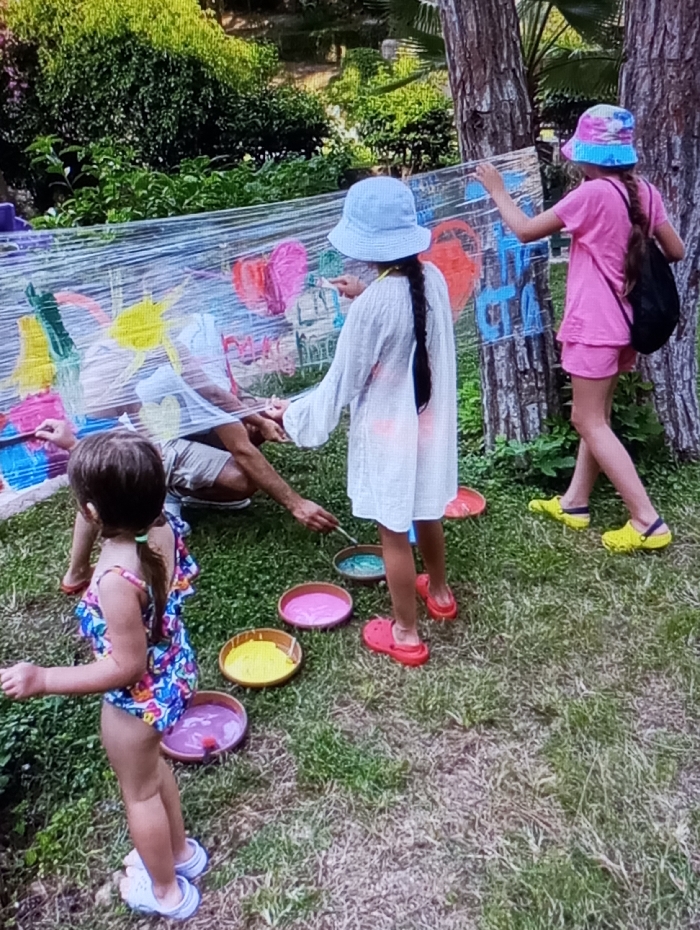 The image captures an outdoor art activity in Kichik Tasmachi, Uzbekistan, involving four individuals painting on a transparent film stretched horizontally in a grassy area bordered by dense foliage and trees. In the foreground, a young female child with dark hair in pigtails wears a multicolored swimsuit and white Crocs-style sandals, standing with her back partially to the viewer, facing the transparent film. To her right and slightly behind, an adult, only partially visible from the waist down, wears light-colored shorts and dark footwear, crouching or kneeling near the lower section of the transparent film. To the right of the adult, a female child in a light blue bucket hat, a white long-sleeved tunic, and red Crocs-style sandals actively applies paint to the transparent film with a brush. Her dark hair is in a single braid. Further to the right, another female child, wearing a multicolored bucket hat, a pink t-shirt, pink shorts, and bright yellow Crocs-style sandals, also paints on the film. She carries a black backpack on her left shoulder. The transparent film displays various colorful painted marks, including hearts and abstract designs in red, pink, yellow, green, and blue. Five shallow, round bowls containing liquid paints in shades of turquoise, pink, yellow, and purple are arranged on the grass directly in front of the participants. The ground is covered in green grass with some visible soil patches. The background features lush green vegetation, including tree trunks on the right side of the frame.