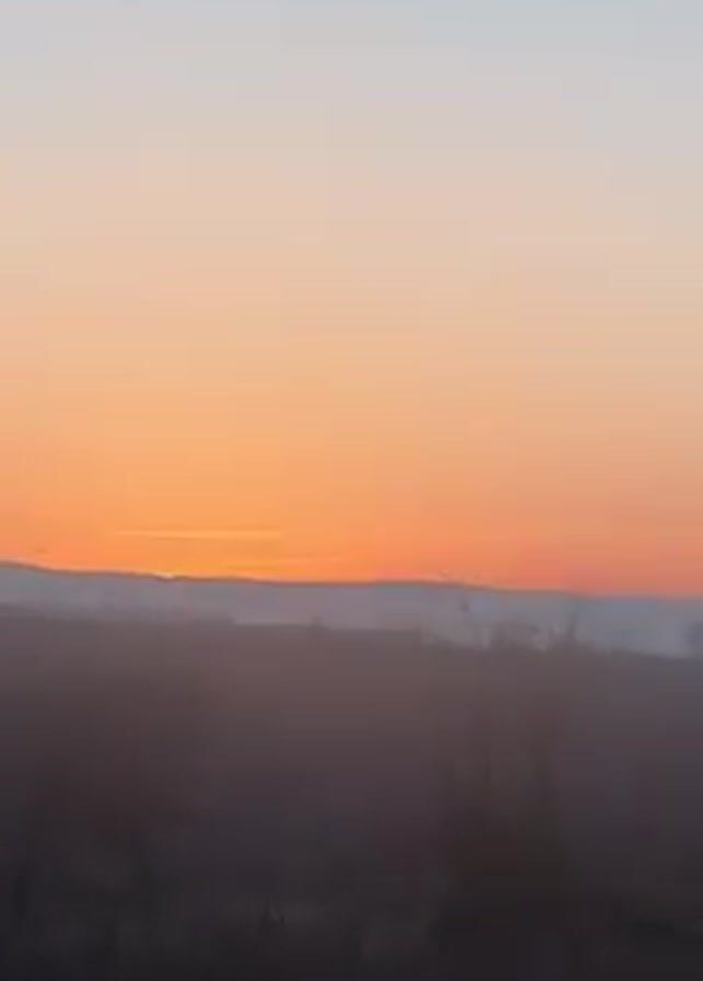 landscape at dawn or dusk. The sky transitions from pale blue at the top to orange near the horizon, indicating the presence of the sun. A range of hills or mountains is visible on the horizon. In the foreground, there are silhouettes of trees and foliage, obscuring a small field or open area. A simple fence is also visible at the bottom of the frame.