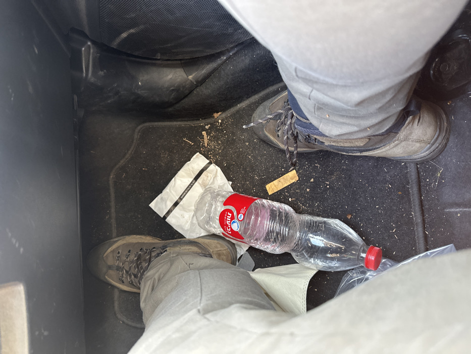 A high-angle view depicts the cluttered footwell of a vehicle in Unknown, Israel. Two pairs of legs, wearing light-colored pants and worn dark brown hiking boots with black and white laces, are visible. The left leg extends from the upper left, its foot resting on a black floor mat. The right leg is partially visible on the lower right, with its foot also on the mat. Between the feet, a partially compressed clear plastic water bottle with a red cap and a red label featuring the Hebrew text "מי עדן" (Mei Eden) lies horizontally on the mat. Next to the bottle, a crumpled white paper item with a black stripe and black text, possibly a napkin or wrapper, is present. A small, flat, light-brown rectangular object, approximately 4-5 cm in length, is situated near the right boot. The black floor mat is visibly soiled with dust, dirt, and small debris. The surrounding vehicle interior components, including the dashboard underside and side panel, are dark grey or black plastic.