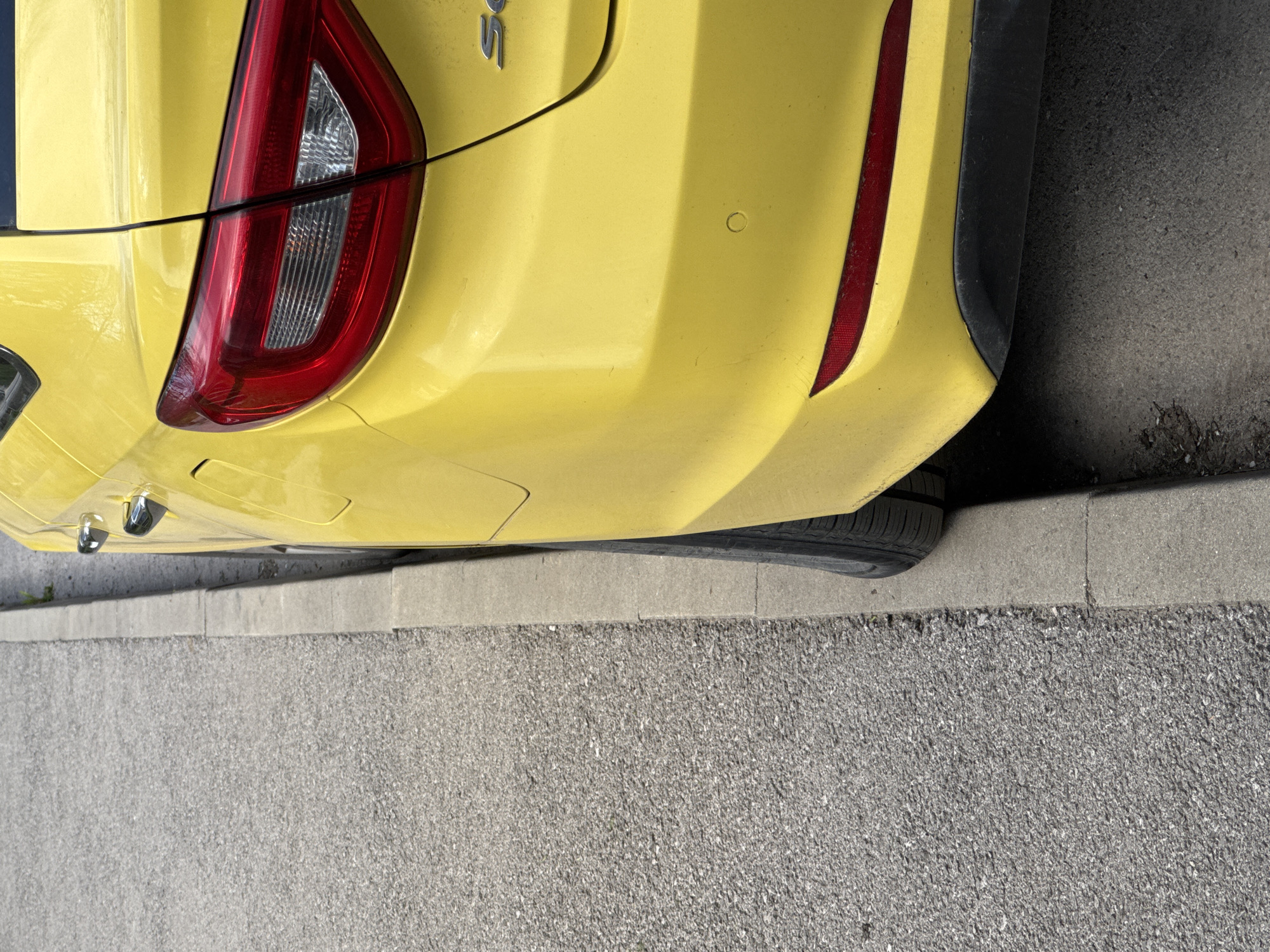 The image depicts the rear portion of a yellow car, specifically the passenger side taillight and rear bumper area, parked very close to a concrete curb