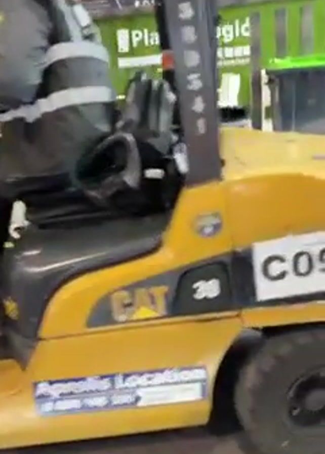 A person wearing a gray vest and dark clothing is operating a yellow CAT forklift indoors