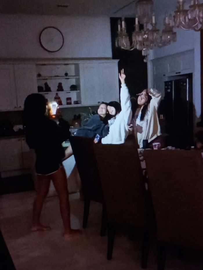 The image depicts an indoor scene occurring in a dimly lit residential kitchen and dining area. Four individuals are present. On the left, a person, appearing female, is standing barefoot, wearing a dark long-sleeved top and light-colored shorts. This individual holds a smartphone with its screen or flashlight illuminated, directing the light towards the center of the frame. In the middle ground, three other individuals, also appearing female, are grouped around a table with dark-upholstered chairs. One individual, wearing a dark long-sleeved top, is seated at the table. To her right, a second individual, in a light-colored long-sleeved top, is positioned with her left arm raised vertically. A third individual, likewise in a light-colored long-sleeved top, is situated further right, making a hand gesture near her head. The background on the left features white upper kitchen cabinets, with some open shelves displaying various bottles and decorative objects. A dark circular item is mounted high on the wall above these cabinets. On the right side of the image, a large, multi-tiered crystal chandelier hangs from the ceiling, and a dark-colored refrigerator or tall cabinet is visible. The foreground shows the backs of several dark-upholstered dining chairs. No specific landmarks or identifying architectural features are discernible within the image to determine a precise location in the city of Wrocław, Poland.