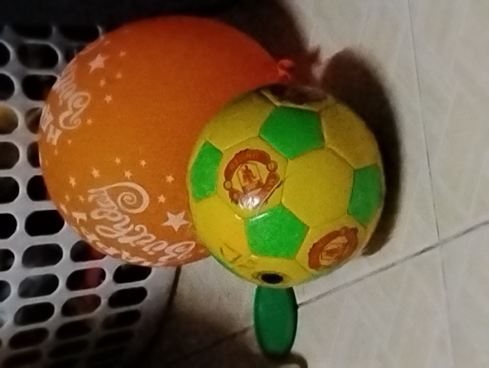 The scene is an indoor environment in Kikuyu Township ward, Kenya. Centrally positioned in the foreground is a small, deflated, or partially deflated, toy soccer ball. The ball features an alternating pattern of yellow and green hexagonal segments, with red Manchester United crests visible on some yellow panels. Immediately behind the soccer ball stands an inflated orange balloon, displaying white "Happy Birthday" text and star motifs. Both objects rest on a light-colored tiled floor with visible grout lines. A section of a white, perforated plastic basket is discernible in the blurred background to the upper left. A small, indistinct green, disc-shaped object is partially visible on the tiled floor to the left of the soccer ball. No individuals are present; all objects are stationary.