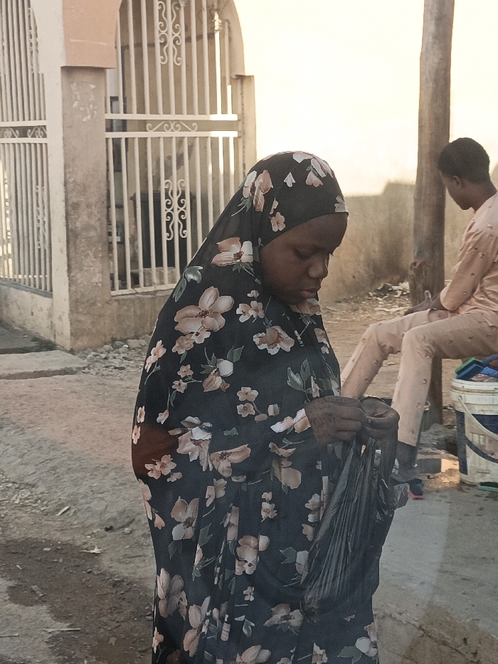 A woman wearing a black floral dress and headscarf stands outside, focusing on a black plastic bag she holds with both hands. Behind her is a gate and a building, along with a person sitting near a utility pole. The overall setting appears to be a somewhat dusty, informal outdoor area. The lighting suggests it might be early morning or late afternoon.