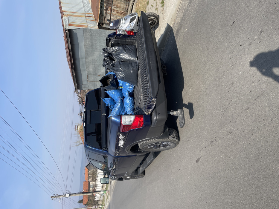 This image depicts a dark blue Nissan Titan PRO-4X crew cab pickup truck parked on the right side of an asphalt road in Resilovo, Bulgaria, under a clear, light blue sky. The truck is oriented facing away from the viewer, with its tailgate lowered. The truck bed is filled with waste bags: several blue bags are clustered on the driver's side, and multiple black bags are on the passenger's side. A black, retractable step is extended from beneath the truck's rear bumper on the driver's side. On the left side of the road, a utility pole with multiple overhead power lines is visible, extending across the frame. Beyond the road and utility pole, residential buildings with red-tiled roofs and white facades are visible, set against distant hills or mountains. The ground on the far left shows sparse vegetation. On the right side of the truck, a weathered building with corrugated metal siding and a rusty metal roof is partially visible. A silver-colored scooter or moped is parked to the right of the truck's rear, with its front portion obscured by the truck bed. A wire fence is visible further to the right, next to a patch of dirt and sparse grass. The asphalt road in the foreground shows minor markings and a distinct human shadow, indicative of the photographer, cast towards the lower left. No individuals are otherwise visible within the frame.