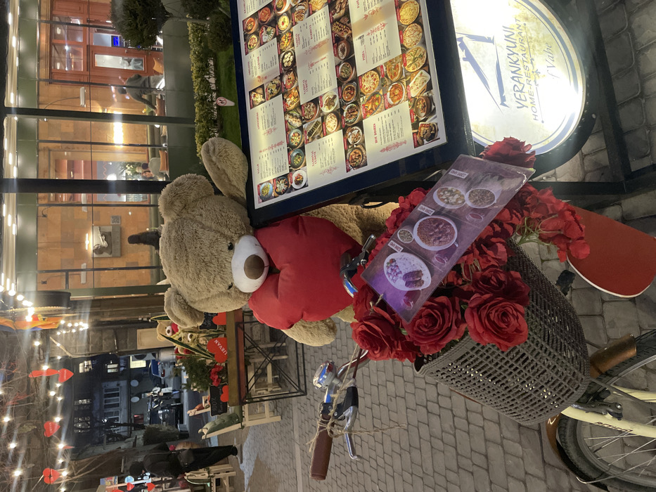 The image presents a night-time street scene in front of the "YERANKYUNI HOME-RESTAURANT of Vahe" on a cobblestone street in Yerevan, Armenia. In the immediate foreground, a light-colored bicycle is partially visible on the left. Its handlebars, equipped with a silver bell, are brown. A dark, wicker-style basket mounted on the front of the bicycle contains a large quantity of artificial red roses, with some spilling over the sides. A red heart-shaped object is attached to the bicycle's frame below the basket. The central focus is a large, light-brown stuffed teddy bear positioned upright. The bear wears a prominent red heart-shaped pillow on its chest, and its left arm (viewer's right) is slightly raised. Adjacent to the bear on the right is a vertical, illuminated outdoor menu board displaying numerous food dishes with corresponding prices, categorized under headings such as "SALADS," "APPETIZERS," "NATIONAL CUISINE," "BURGERS," "PIZZA," and "FAST FOOD." Below this menu, an illuminated circular sign prominently displays the restaurant's name: "YERANKYUNI HOME-RESTAURANT of Vahe." To the left of the teddy bear and bicycle, an outdoor seating area for the restaurant is arranged on the cobblestones. It consists of multiple tables and light-colored chairs, some with green upholstered seats. Small red floral decorations and signs, one visible with "LIEVAN" text, are present on some tables. Overhead, string lights with red heart-shaped elements are strung across bare tree branches. A person dressed in dark clothing is partially visible walking away from the camera on the far left. The background features the restaurant building, characterized by large glass windows and a light-brown or orange-toned facade. Through the windows, multiple patrons are visible inside the brightly lit restaurant, seated at tables. Further in the background, other indistinct buildings and parked vehicles line the street under dim ambient and street lighting. The overall lighting suggests evening or night.