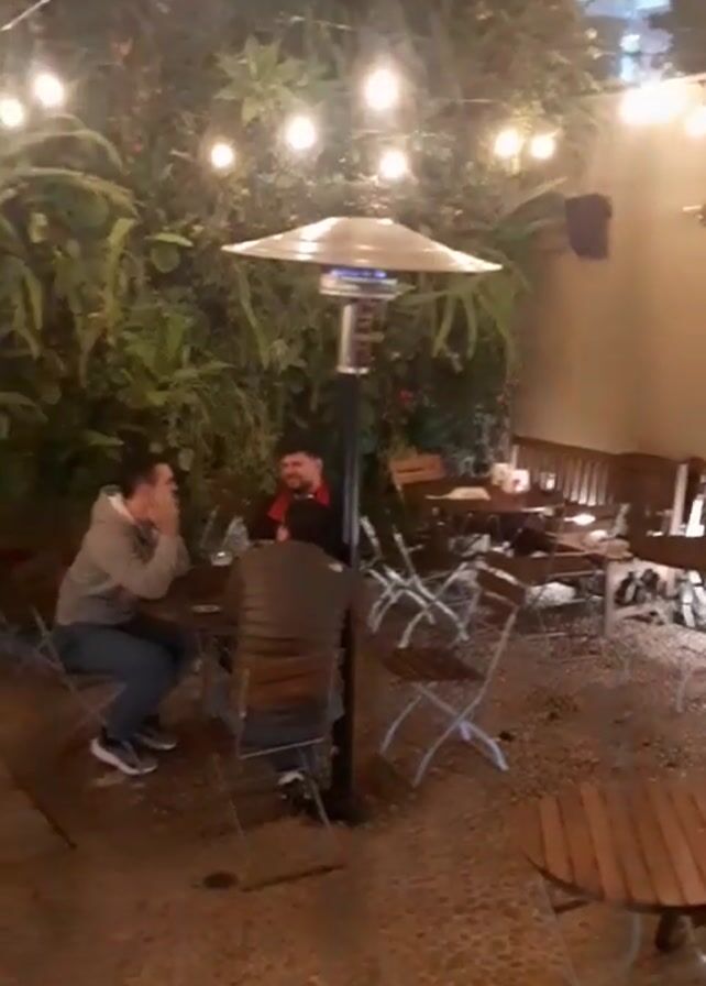 n outdoor seating area of a restaurant or bar at night. The area is decorated with string lights and has several tables and chairs arranged on a gravel surface. There is a gas heater in the center of the area. Several people are seated at the tables, talking and drinking. One person is wearing a green hat and another has fairy wings. The area is enclosed by a wall on one side and a fence on the other. There are plants and greenery around the perimeter of the area.