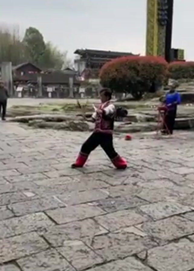 performer in traditional clothing manipulating small, white discs in each hand. He is performing in a paved outdoor area. To his right, another person, also in traditional dress and headwear, is playing a small drum. There are other people and buildings in the background. The sky is overcast.