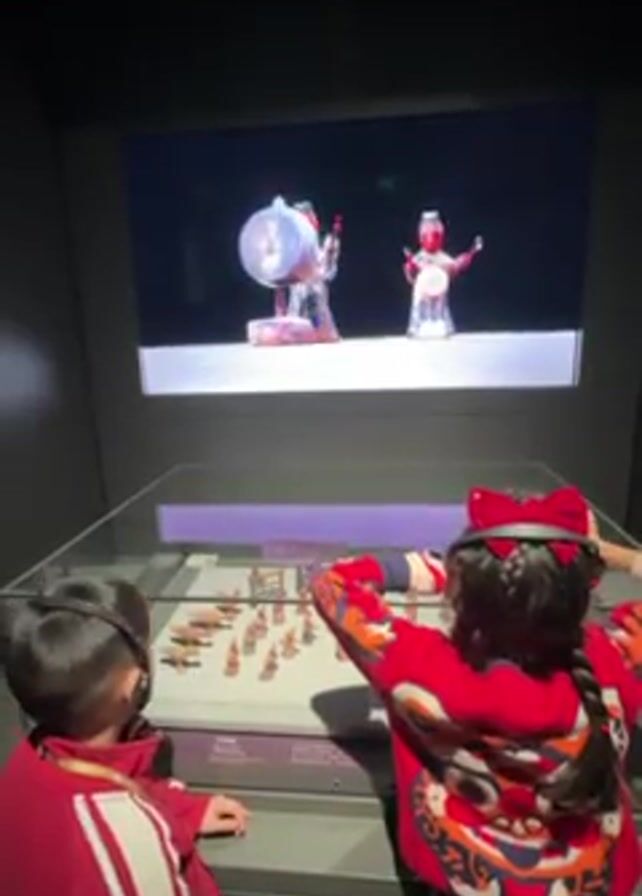 Two children are in a darkened room, looking at a display. A boy with short dark hair is wearing a red and white striped jacket and headphones. He stands to the left. To his right, a girl with a long braid, decorated with a red bow and headband, is wearing a red sweater with colorful patterns and black and white striped pants. She has her hands raised in front of her. Both children are looking at a glass-enclosed display case filled with small figurines. Above the display case is a screen playing a video of similar, but larger, figurines. The video shows two figures in a bright, minimalist setting. One is holding a long, thin object, while the other stands near a large, colorful structure. The room appears to be a museum.