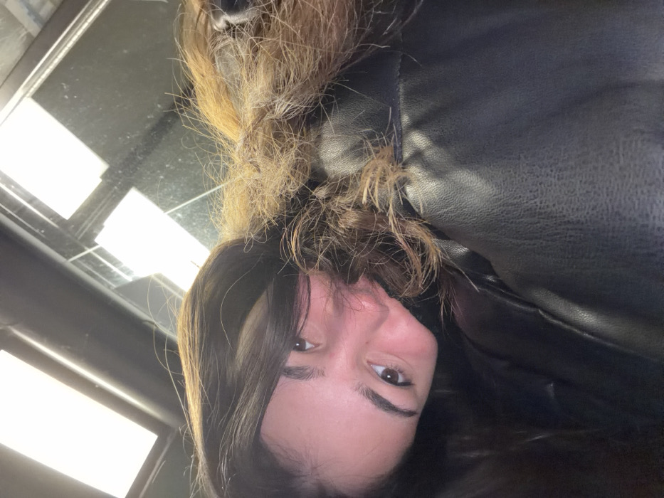 The image displays a tilted, close-up view of an individual, presumably female, in an indoor setting within Bischheim, France. The subject's face occupies the left and central portion of the frame, angled towards the viewer, revealing a visible left eye, nose, and part of the mouth; the left cheek exhibits a reddish flush. Dark brown, straight hair covers the left side of her head and partially obscures the forehead. To the right, her hair transitions to a lighter, auburn-brown color with a visibly frizzy texture. The individual is wearing a dark, possibly black, leather or faux-leather jacket, with creases and texture visible on the fabric. The background consists of a dark, reflective surface, possibly glass or polished metal, showing reflections of two distinct, rectangular overhead light fixtures emitting bright white light. The overall illumination suggests an artificial light source.