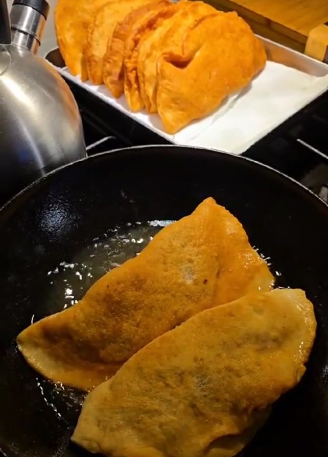 In a kitchen setting, a black skillet on a black gas stovetop holds two golden-brown, semi-circular fried pastries submerged in oil. To the left, a stainless steel kettle sits beside the stovetop. Behind the skillet, a metal tray lined with white paper holds a stack of similarly fried pastries. A wooden cutting board is visible in the background, partially obscured. The scene is brightly lit, highlighting the textures of the food and kitchen surfaces.