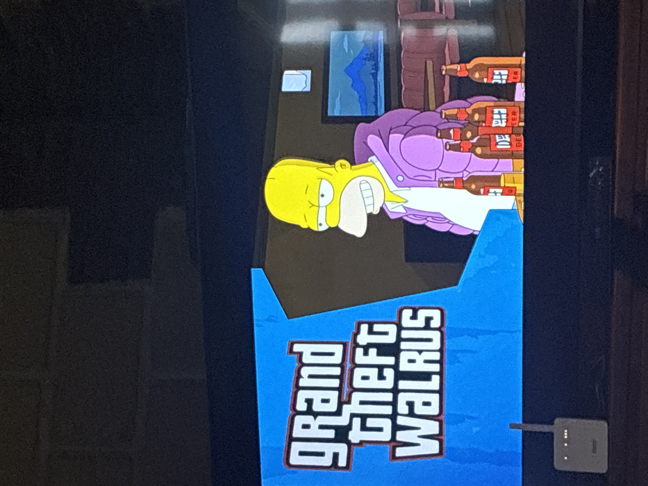 The image is of a television screen displaying an animated scene from "The Simpsons." It shows Homer Simpson, looking angry, holding several bottles of beer in each hand. A blue background features the text "Grand Theft Walrus," parodying the "Grand Theft Auto" video game franchise. The scene appears to be a parody or a gag within "The Simpsons."
