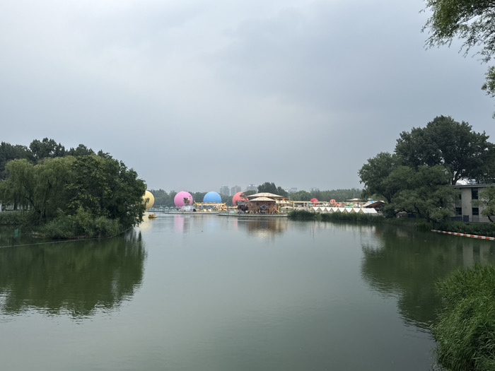 A tranquil lake reflects an overcast sky, fringed by lush green trees on either side. In the distance, a colorful array of giant balloons—yellow, pink, blue, and orange—adds a whimsical touch. A small structure, possibly a boathouse or pavilion, sits on the lake, connected by a pathway adorned with white tents. Tall reeds border the water's edge in the foreground.