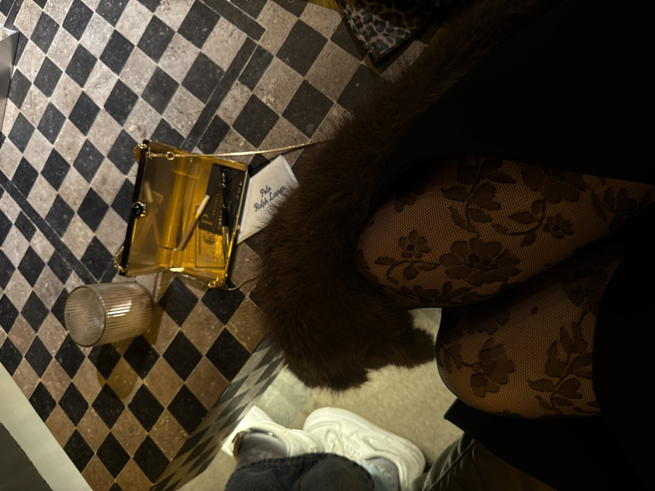 The image depicts a seated figure wearing floral lace stockings and a dark garment adorned with fur. On the checkerboard patterned floor sits a clear glass, a gold clutch purse, and a Polo Ralph Lauren cloth. The figure wears white sneakers.
