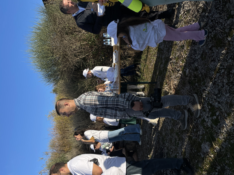 An outdoor scene in Dubravcevina, Montenegro, captured under a clear blue sky, shows a group of individuals gathered on rocky, sparse ground with dense scrub brush in the background