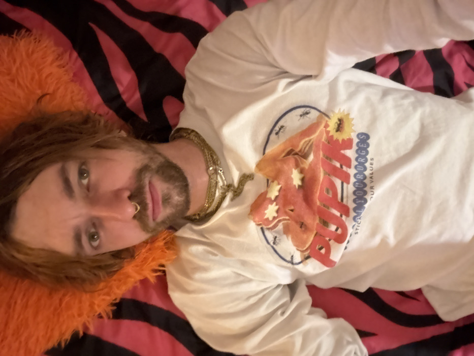 A person with brown hair and a beard lies on a zebra-striped surface. They wear a white long-sleeved shirt with a logo featuring the word "PUPPK" and an image resembling Australian states. The person has a nose ring and several gold necklaces. An orange, fluffy object, possibly a pillow, is near their head. The person's gaze is directed towards the camera.