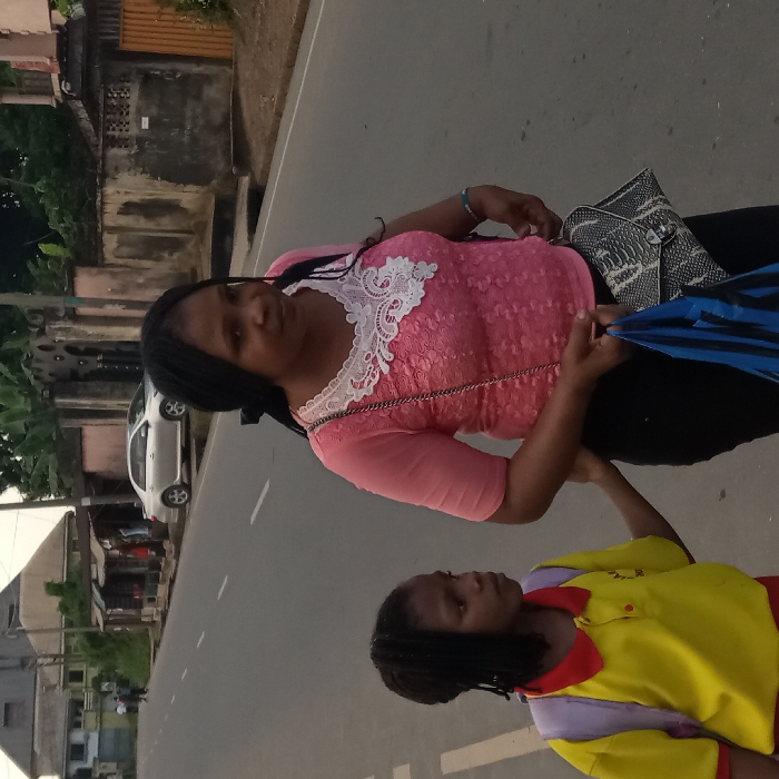 Two women stand on a gray road lined with buildings. The first woman, likely older, wears a pink lace top with a white lace collar, paired with black pants. She holds a blue striped umbrella. The second woman, younger, wears a yellow and red polo shirt with a lilac backpack strap visible. The setting is possibly urban or suburban, with houses and trees flanking the road. A white car is parked along the road.