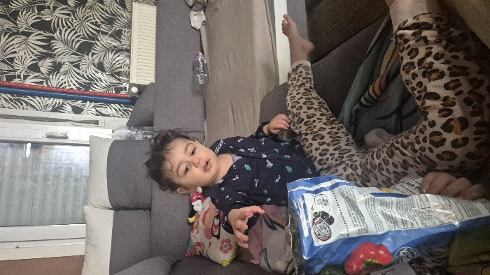 An indoor scene features a young child, approximately a toddler, with dark, curly hair and light complexion, seated upright on a grey sectional sofa. The child wears a navy blue long-sleeved shirt with a light-colored pattern and faces forward with a slightly open mouth, extending their left hand towards a blue and white bag of Lay's potato chips in the foreground. This snack bag partially obscures the lower body of a second individual, whose legs are clad in leopard-print leggings, also seated on the sofa and supporting the child. A multi-colored blanket or throw is draped over the second individual's legs, and their bare feet are visible. Behind the child, a patterned pillow featuring a floral or abstract design, topped with a Mickey Mouse plush toy, rests on the sofa. To the child's right, a clear plastic water bottle and some crumpled white material are present on the grey sofa cushion. The background reveals a large window or glass door, providing an obscured view to the exterior. Adjacent to the window on the right, a wall is covered with dark wallpaper adorned with a white palm leaf pattern. Two vertical pipes, one red and one blue, are mounted on this wall above a white radiator. No specific visual identifiers for a location within Melle, Belgium, are present in the image.