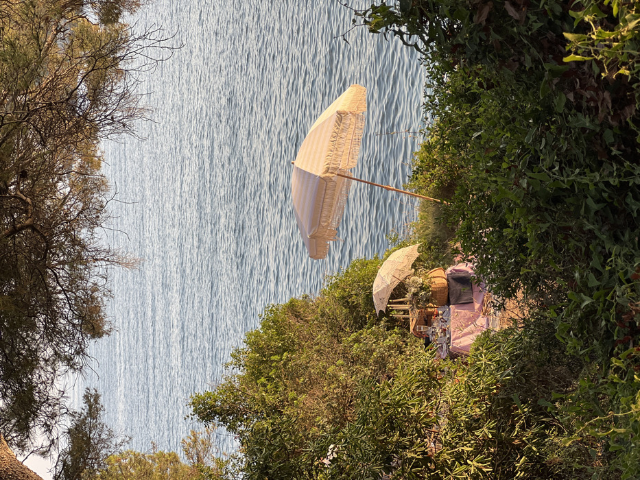 A serene seascape dominates the scene, bordered by foliage. A large, striped parasol leans toward the water, casting shade over an outdoor setting. A smaller parasol covers a picnic arrangement with pillows and wicker baskets. The scene exudes a calm, coastal vibe, with the lush greenery contrasting with the sparkling water.