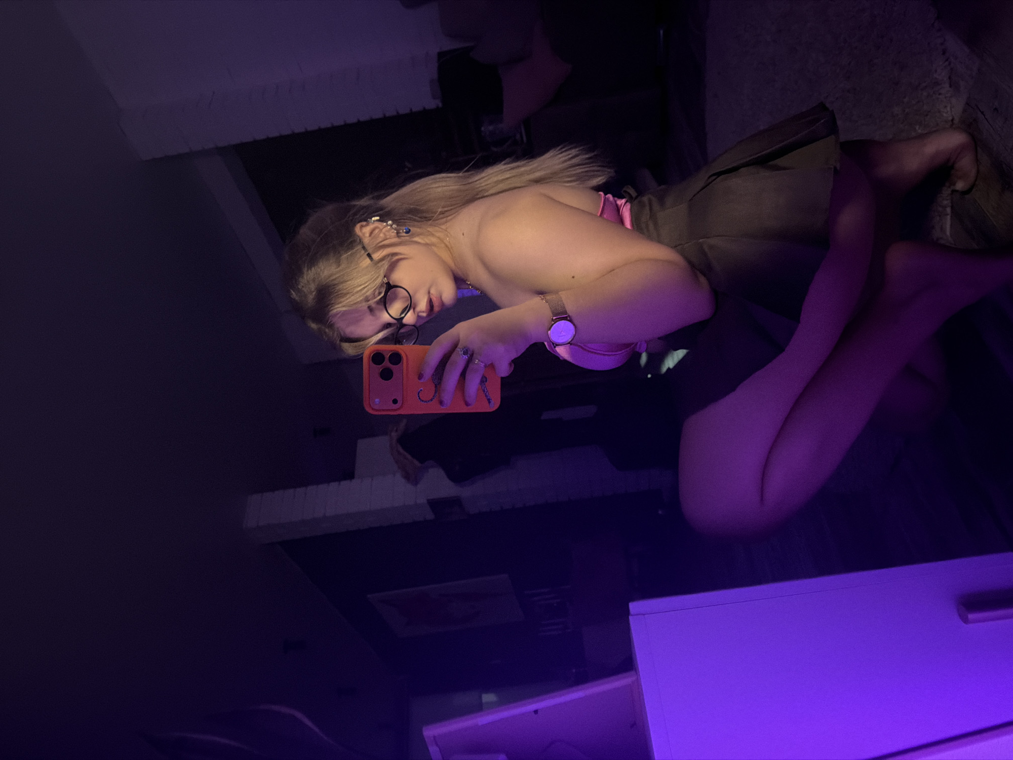 A young, fair-skinned woman with long blonde hair and glasses is holding a phone and taking a selfie. She wears a pink top and a dark-colored skirt. She is indoors; a keyboard is partially visible near her. The setting appears to be a room in Большая Шильна, Russia, given the location.