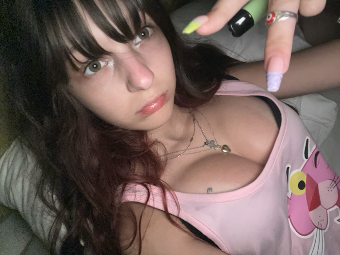 A female individual is depicted in a close-up, chest-up portrait, looking directly at the camera. She possesses long, dark brown hair with bangs and light-colored eyes. Her lips are full and appear to have a light pink gloss. She wears a light pink tank top, possibly a sleep shirt, with a graphic of the Pink Panther character visible on the right side of her chest. A black bra is visible beneath the tank top. Two necklaces are worn, one with a small silver charm and another with a heart-shaped pendant. A small, dark tattoo is visible on her upper chest, between her breasts. Her right hand is raised, holding a green and black vape pen between her thumb and index finger. Her right thumbnail is painted bright yellow/lime green, and her right index fingernail is light purple with a subtle pattern. A silver ring with a red 'evil eye' motif is on her right middle finger, and another plain silver ring is on her right ring finger. A white pillow is visible behind her left shoulder and head, indicating an indoor environment. The specific location within Ndlambe Local Municipality, South Africa, cannot be determined from the visual information provided in the image.