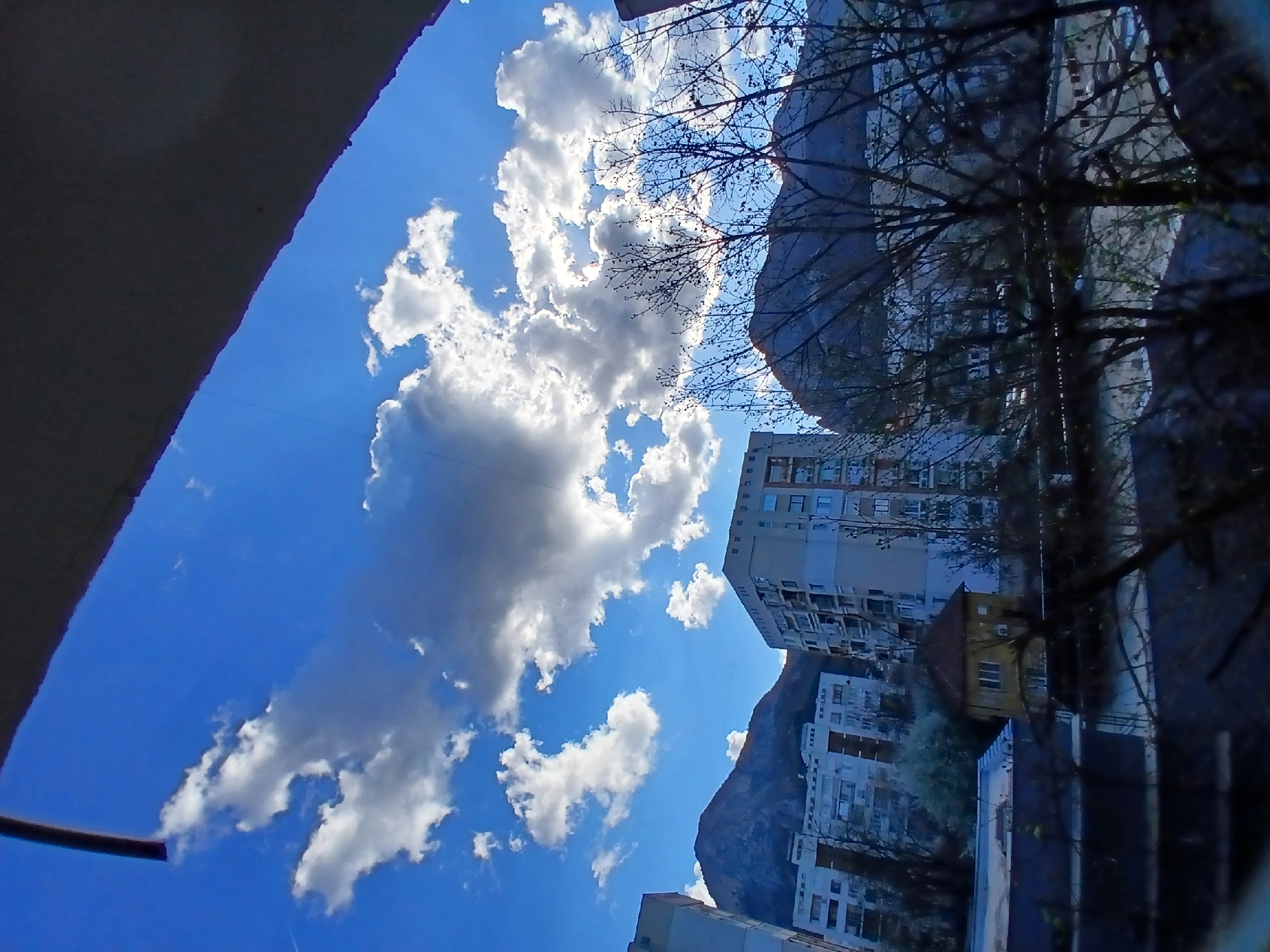 view from a building in Vratsa, Bulgaria. The sky is bright blue with scattered white clouds, partially obscured by a building edge in the upper left. Sunlight streams through gaps in the clouds. Bare tree branches frame the right side of the image, partially obscuring buildings and a mountain in the background. The buildings are multi-story residential structures with visible balconies and windows. A mountain range looms behind them. The foreground includes reflective surfaces on a window sill.