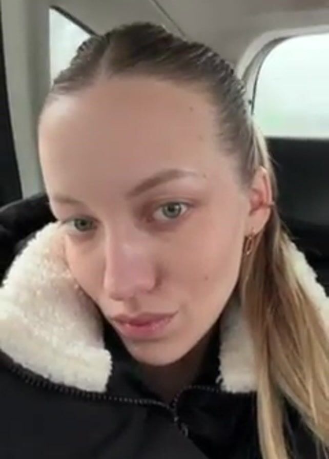 A person with light skin, light hair, and light eyes is sitting in what appears to be a car