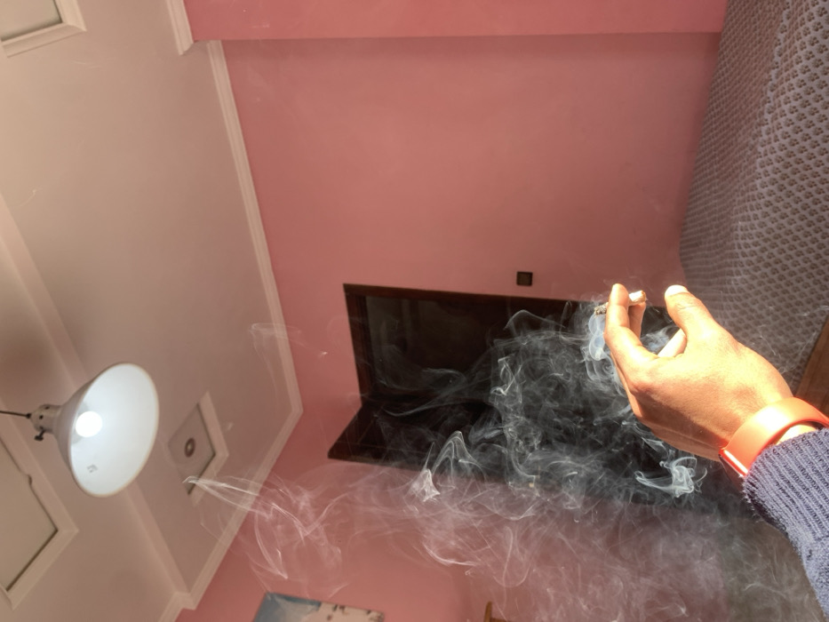 The image depicts an interior room in M'diq, Morocco. A human right hand, featuring dark skin, is positioned in the lower-middle of the frame, holding a lit cigarette or joint. Dense plumes of white and grey smoke emanate from the object held, billowing upwards and to the left. The person wears an orange wristband on the right wrist and a dark blue knitted sleeve. The room's walls are painted a solid light pink, meeting a white ceiling accented with white crown molding. A white, conical-shaped light fixture with an illuminated bulb hangs from the ceiling, which also features two square recessed panels. A dark brown interior door is visible in the background, slightly left of center, with a small dark square object on the pink wall to its right. A bed covered with a textured grey bedspread is present in the lower right quadrant. Sunlight streams into the room from an unseen source, illuminating the smoke and the hand. A partial view of a light blue and white image is visible on the far left wall.