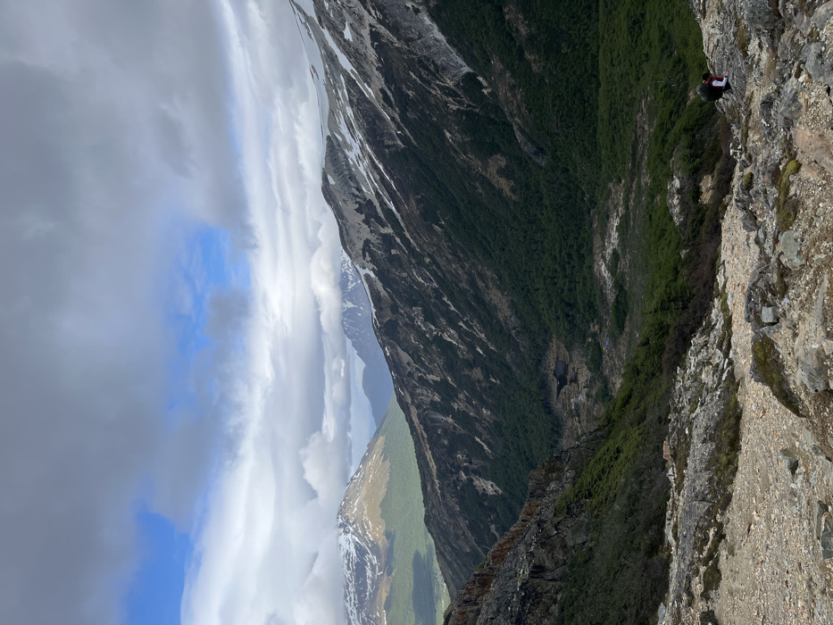 A mountainous landscape displays a mix of terrains. Rocky cliffs dominate the foreground, transitioning into verdant slopes dotted with dense greenery. In the distance, layers of mountains are visible, some streaked with snow. The sky is a blend of blue patches and heavy, gray clouds, suggesting a dynamic weather system in the mountainous region. A person can be seen on the cliff face.