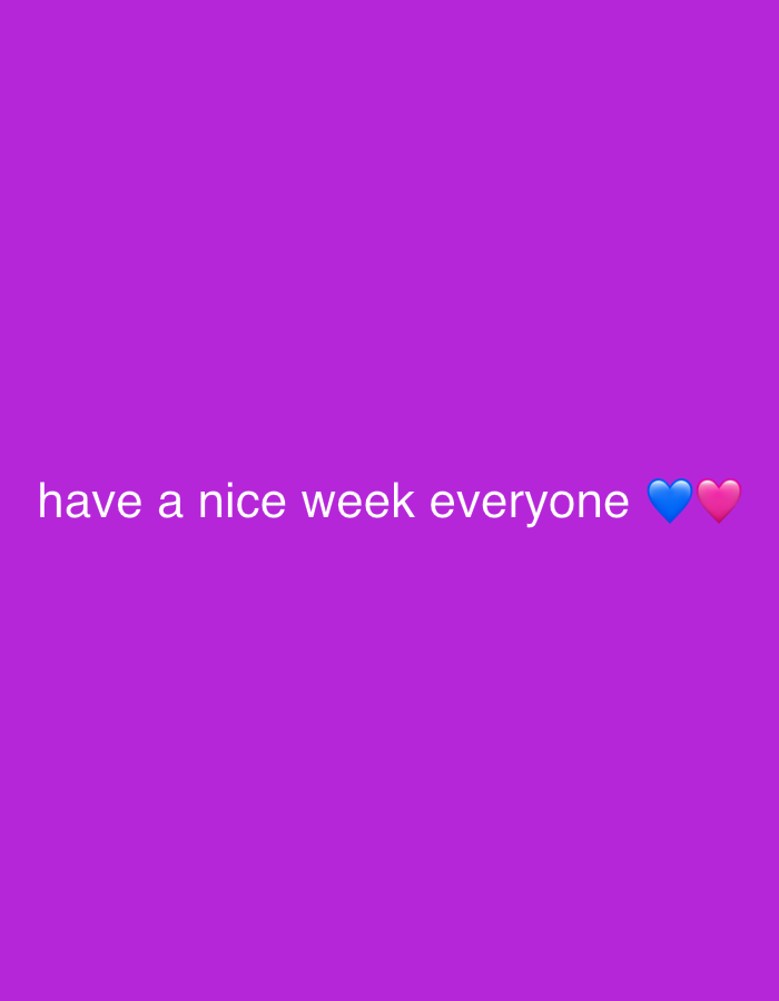 The image displays a solid purple background. White sans-serif text, reading "have a nice week everyone", is horizontally centered and positioned slightly below the vertical midpoint of the frame. To the immediate right of the text, on the same baseline, are two digital heart emojis: a blue heart followed by a pink heart. No people, physical objects, actions, or interactions are depicted. The scene is a graphic display, with no identifiable physical location within the city of Unknown, Unknown.