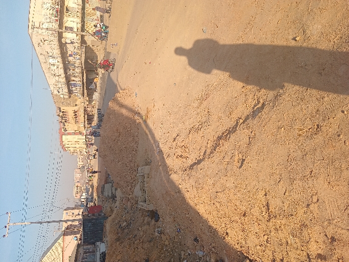 A dusty, possibly under-construction road dominates the foreground. A large shadow stretches across the sandy surface. Beyond, buildings line the road's edge, with visible motorbikes. Power lines run along the left side, near some parked vehicles. The buildings appear to be in a residential or commercial area, set under a clear blue sky.