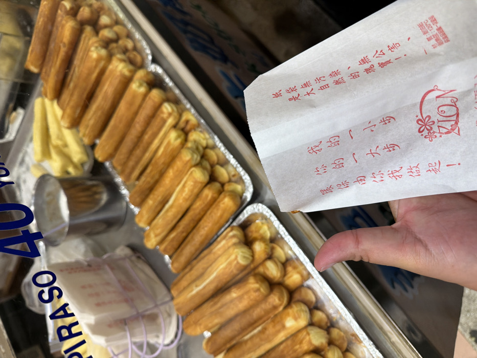 A human hand, primarily showing the thumb and part of the palm, holds a white paper bag in the lower right foreground. The bag is printed with red traditional Chinese characters promoting environmental protection, stating "Environmental protection starts with you and me!" and describing the paper bag as pollution-free, natural, and harmless, along with "ZION" in a stylized logo. The background reveals a food stall counter, likely situated in New Taipei, Taiwan. Multiple rows of elongated, golden-brown, cylindrical pastries are arranged in stacks on rectangular, silver-colored trays, which appear to be lined with aluminum foil. Behind these, another tray holds shorter, lighter yellow food items. A silver metallic cup containing a white liquid is visible on the counter to the left, alongside a rack holding white paper napkins. A transparent barrier or display case is present, with blurred blue lettering visible, including "SO PIRA" and "40."